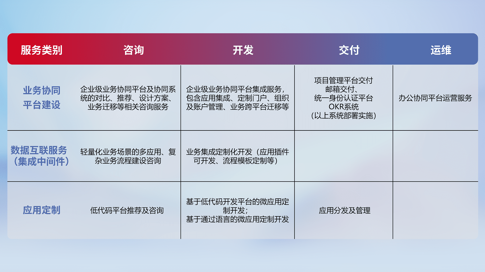 针对钉钉、、、企微、、、IDaas等平台级产品提供产品的规划、、、、方案、、、交付、、、定制化开发等服务,,实现如统一协同办公、、、智能客户服务、、、、混合会议管理、、、智能数据查询、、等业务场景,,实现数字化转型。。。