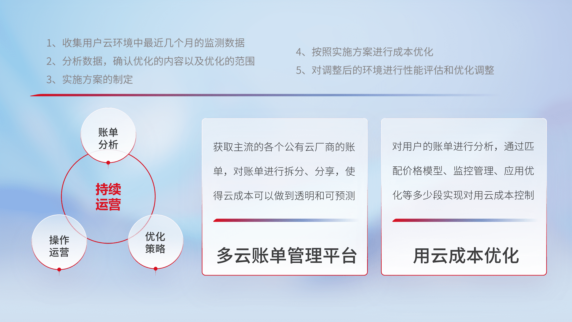 监控业务系统资源开销,,,,对资源的消耗精确计量,,,,实现费用的透明化管理,,,不断提升资源使用率,,调整资源购买方式,,,,降低资源费用成本,,,用云成本可预测、、用云费用可优化,,云资源配额有据可依。。